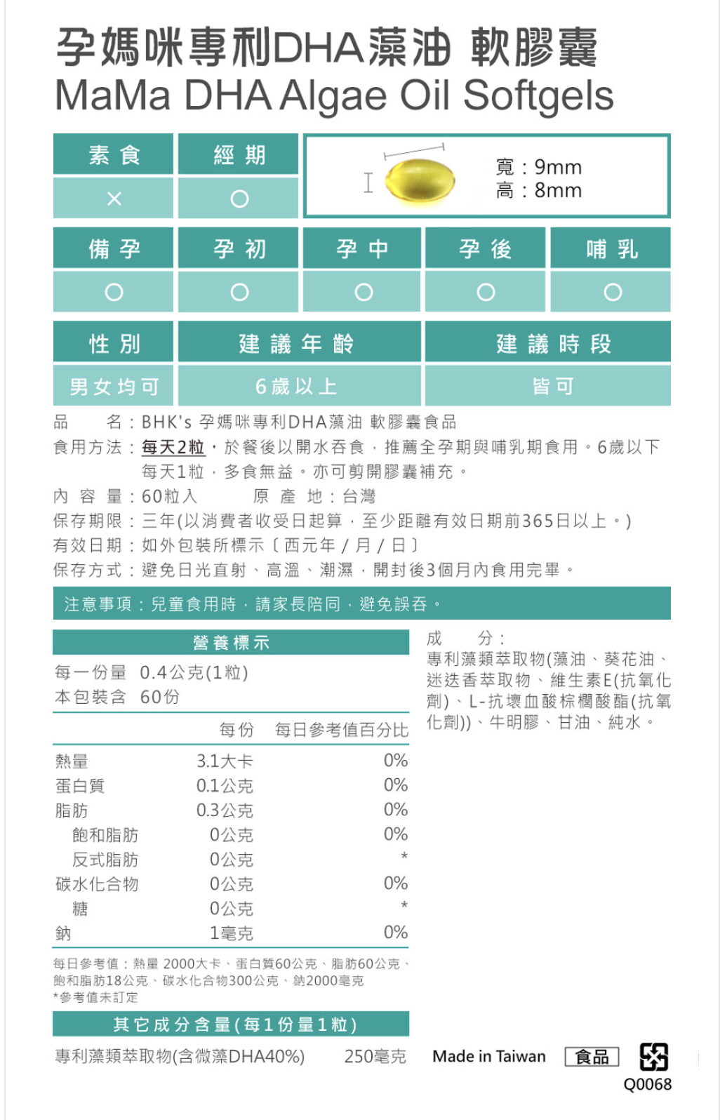 另外我真的很喜歡BHK’s 的標示方式,素食是否可吃、經期、備孕、孕初期、孕中期、孕晚期、哺乳、年齡、使用時段,一天要吃多少,每一項都寫得非常清楚。