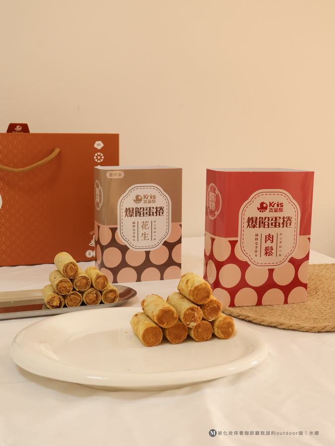 一年三大節日,中秋、端午、過年,其中一個節日我一定會選蛋捲!覺得他是不論男女老少、配茶配咖啡都適合的點心!Kris克里酥蛋捲是我吃過好吃蛋捲之一!我最愛的兩大口味-肉鬆、花生和滿滿餡料,吃起來超級過癮!下午茶時段配個紅茶或是黑咖啡真的好幸福~一口一個蛋捲也不會掉的慢桌屑屑難清理,總之Kris克里酥不論是送禮還是自己品嚐都超級讚~~