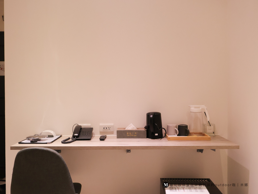 床的對面是一個長桌,上面有客房電話外,還有茶包、水杯、加熱壺。