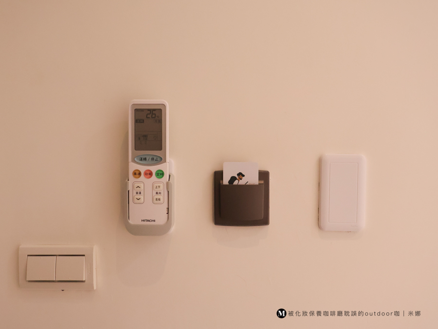 進入門口,一邊可以掛上衣服、外套。另一邊是冷氣遙控器以及插入房卡的卡槽。