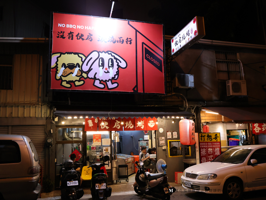 旅店樓下就是忠孝夜市,在對面就有看起來很好吃的燒烤-伙房燒烤。店面不大,不過裡面都是客滿的