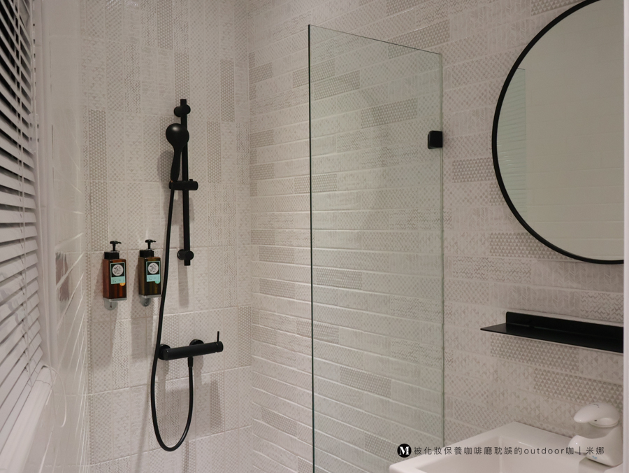 浴室是狹長形的,門的左半邊是淋浴和洗手台。雖然不寬闊,但是非常夠用!而且早上百葉窗透光進來,整個浴室變得好舒服~