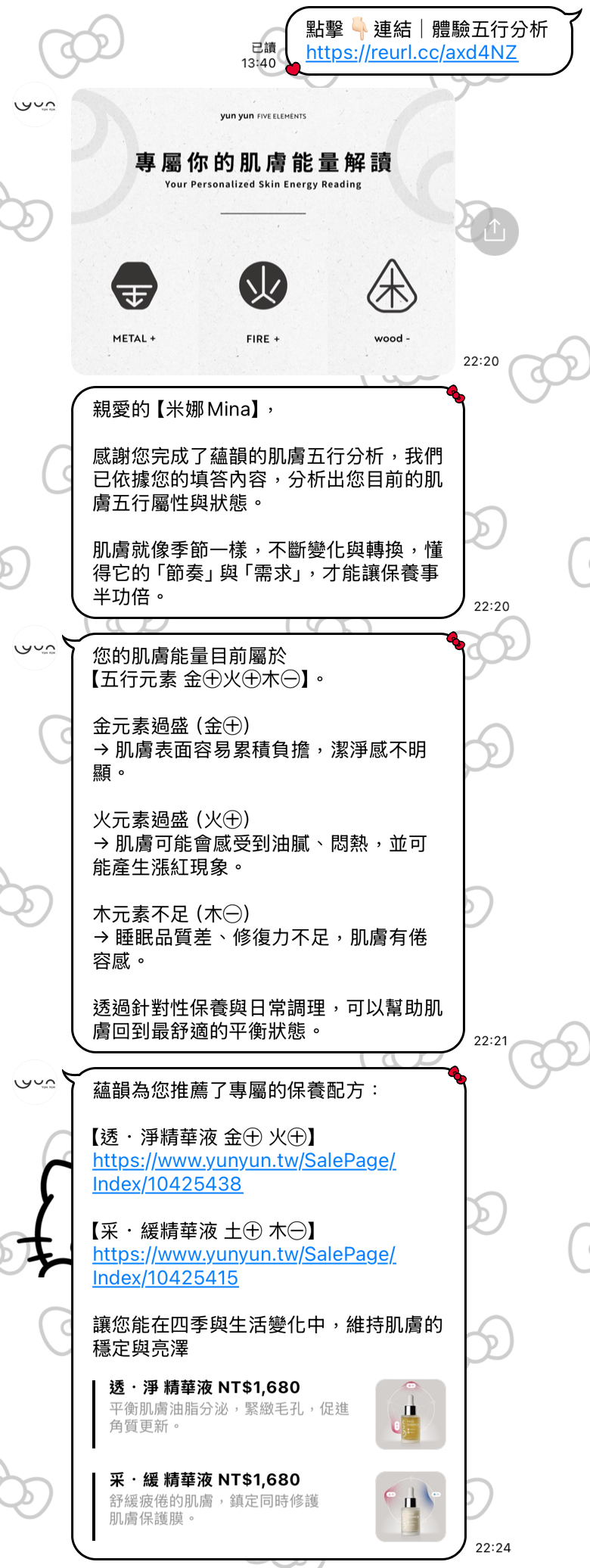 加入Yun Yun 蘊韻官方LINE,詢問客服就可以進行分析。他就會推薦適合現況肌膚的保養品給你囉!